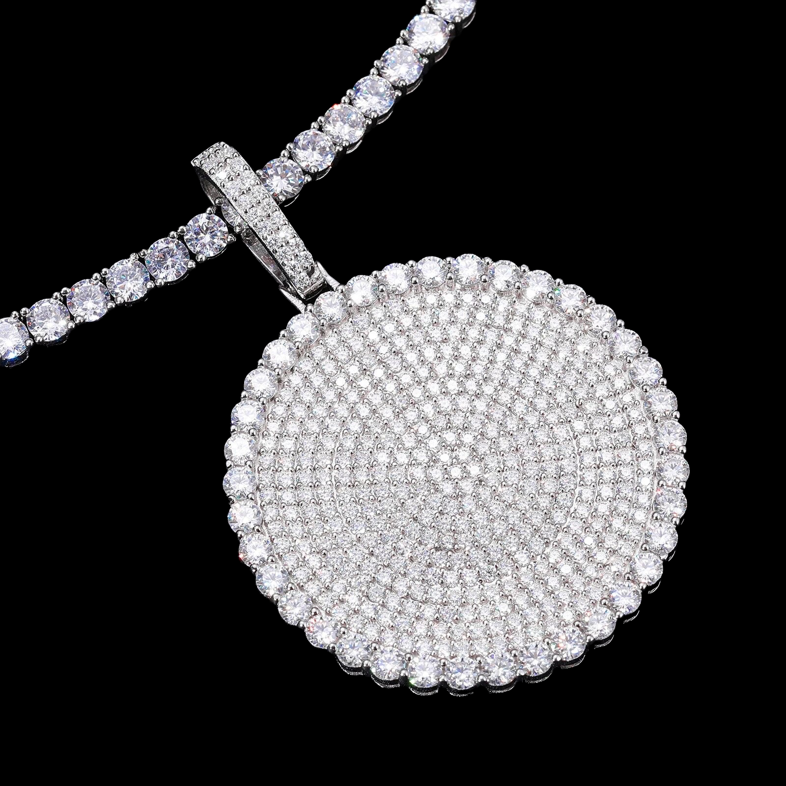 Le pendentif médaillon est en argent et serti à la main de diamants Moissanite de qualité VVS. Nos diamants moissanite ont une couleur D ( blanc exceptionnel) et c'est le grade de couleur le plus élevé.