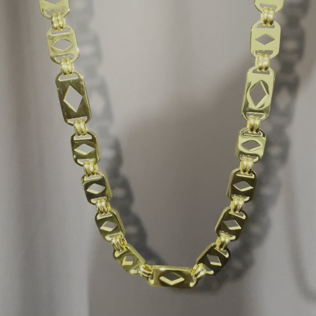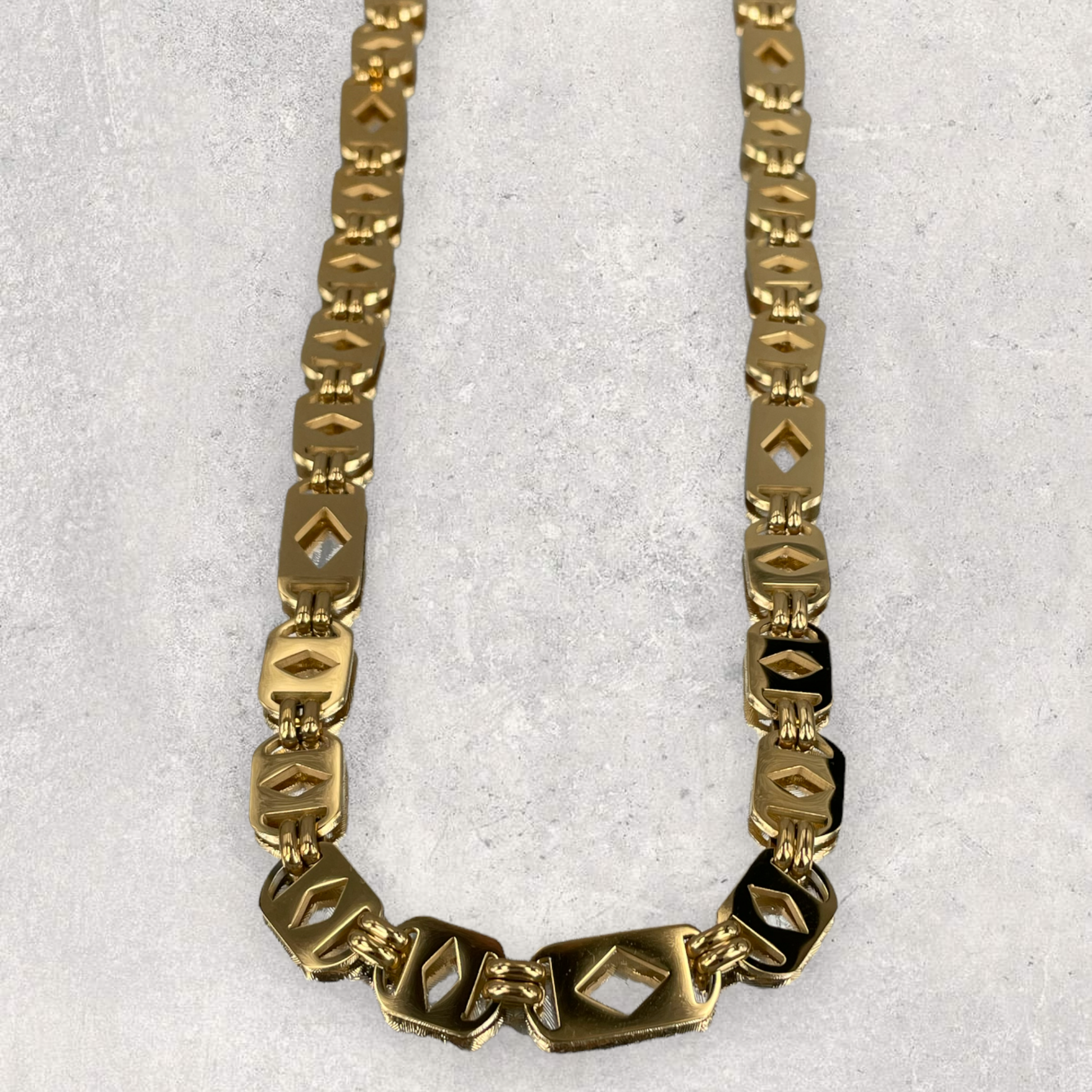 Onze 11 mm, gold plated ruiten koningsketting is een unieke en opvallende ketting. Het is gemaakt van hoogwaardig edelstaal en is vijf maal PVD gold plated, waardoor het niet vroegtijdig zal verkleuren of zijn glans verliezen.